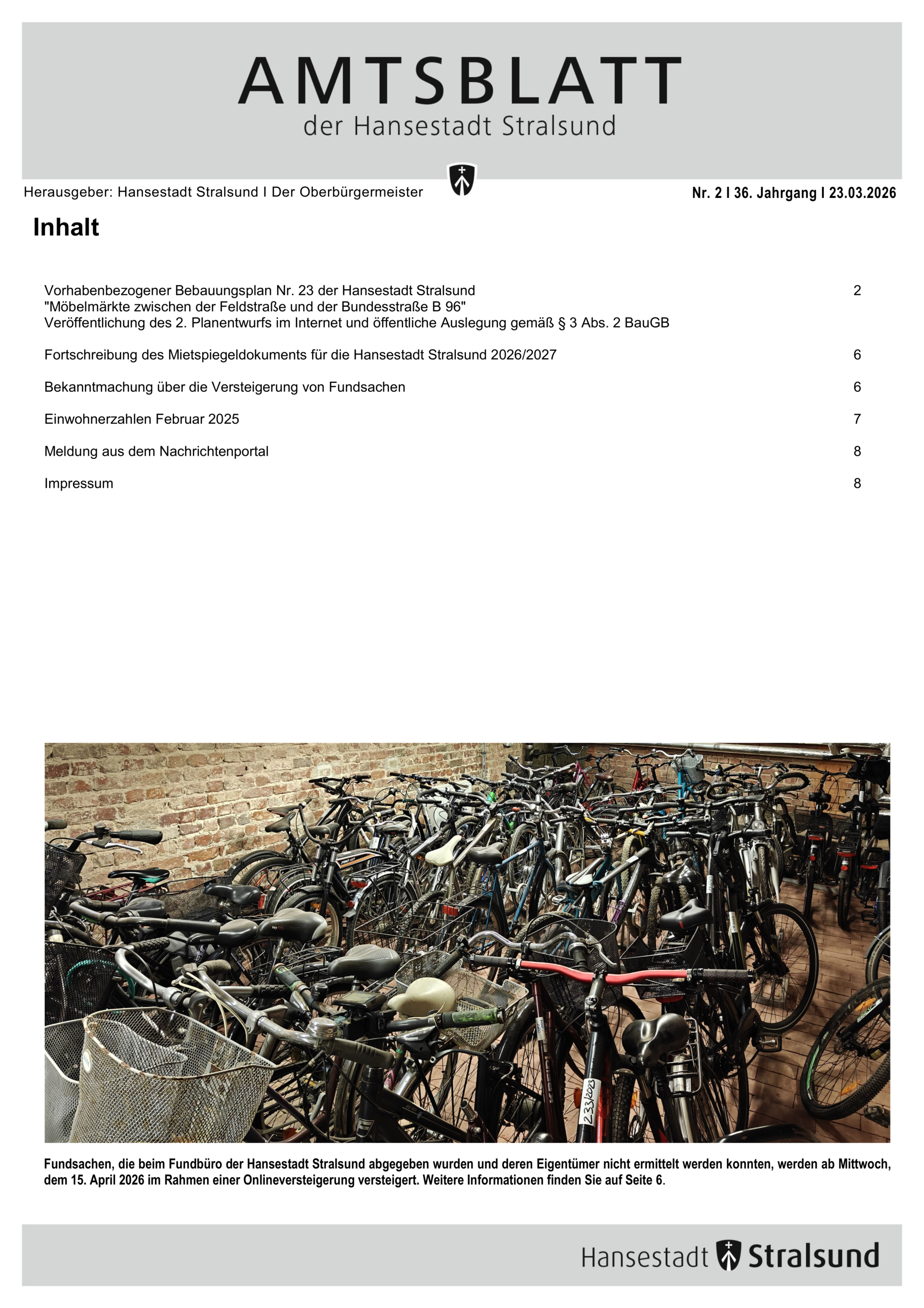 Die Bürgerschaft der Hansestadt Stralsund hat in Ihrer Sitzung am 5. März 2026 die Fortschreibung des Mietspiegeldokuments 2026/2027 beschlossen. Im Amtsblatt Nr. 2 I 2026 wird veröffentlicht, wo das Dokument erhältlich bzw. einsehbar ist.
