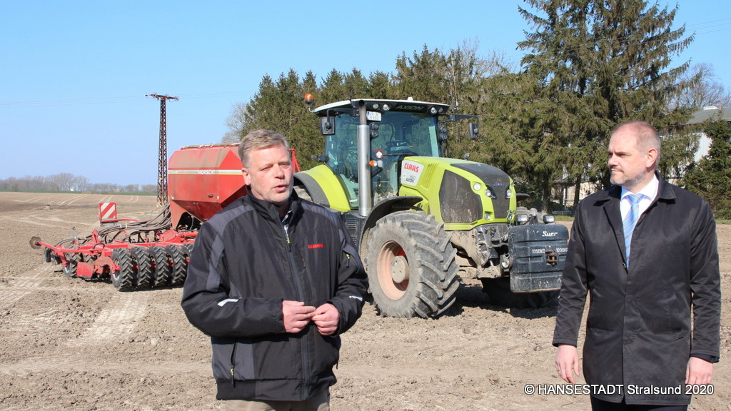 Die Hansestadt Stralsund verpachtet rund 8.000 Hektar Ackerland an 58 Landwirte. Einen von ihnen hat Oberbürgermeister Alexander Badrow jetzt besucht, um sich persönlich darüber zu informieren, wie es an der Furche in dieser besonderen Zeit aussieht. "Der Acker muss bestellt werden. Schließlich wollen wir alle auch weiterhin zu essen haben", berichtet Aurel Hagen und ergänzt: "Mein Dank gilt allen Mitarbeitern und deren Familien - alle machen mit und sind hochmotiviert jeden Tag voll dabei."