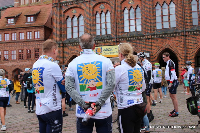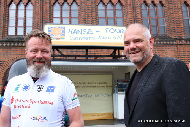 Auf der Bühne sagte Alexander Badrow im Beisein von Claus Ruhe Madsen, Initiator der Hanse-Tour Sonnenschein: "Als Papa von drei Kindern geht mir das Anliegen besonders zu Herzen. Und ich freue mich, dass wir den Spendentopf dank unserer Stadtwerke mit 500 Euro füllen konnten. Stralsund hält zusammen. Auch und gerade, wenn es um das Wohl unserer Jüngsten geht. Ich danke allen Radfahrern, Unterstützern und Spendern. Besser kann man seine Kraft, seine Zeit und sein Geld nicht einsetzen."