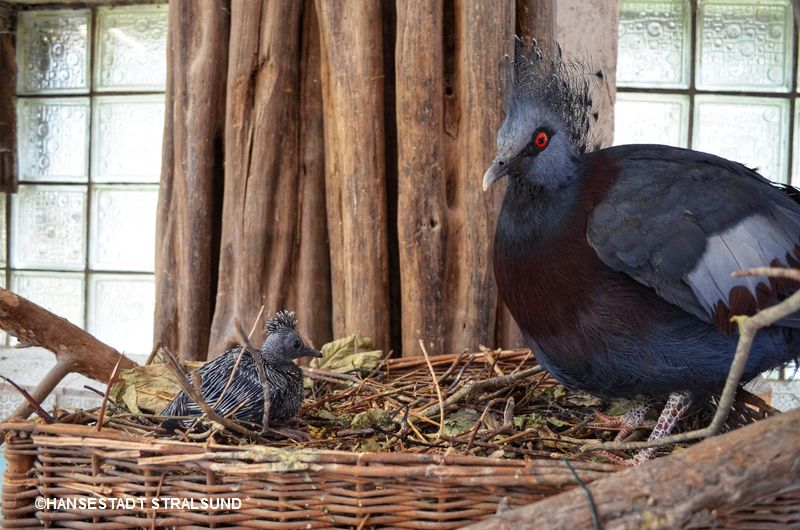 Aus zwei werden drei: Viktoria-Krontaube und Täuber haben fiedrigen Nachwuchs in der Voliere des Stralsunder Zoos bekommen.