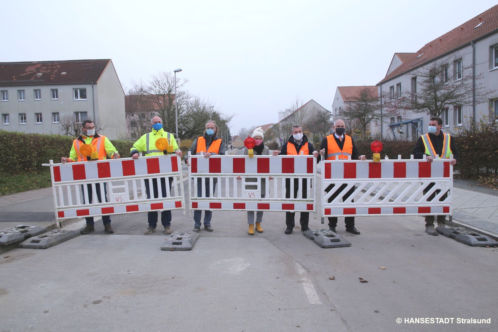 Am heutigen Mittwoch (25.11.2020) gab Oberbürgermeister Alexander Badrow zusammen mit seinen Jungs vom Amt für Planung und Bau sowie je einem der beteiligten Planungsbüros und Bauunternehmen die Große Parower Straße für den Verkehr frei.