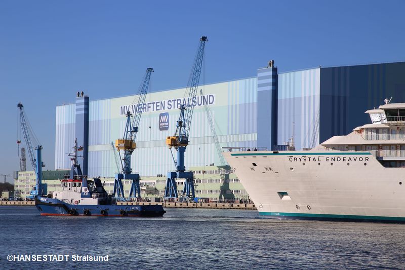 Morgens halb zehn in Stralsund: Pünktlich legte die „CRYSTAL ENDEAVOR“ heute (05.03.2021) bei schönstem Sonnenschein und mit Hilfe von zwei Schleppern zu ihrer ersten Probefahrt ab.
