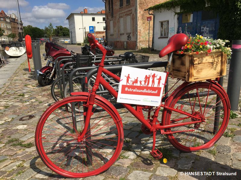 Die Stralsunder Werkstätten haben die Räder rot lackiert, Pflanzkästen gebaut und mit Sommerblumen bepflanzt. Die blühenden Zweiräder sind auch bereits Vorboten auf die Deutschland Tour, die am 25. und 26. August mit der Teampräsentation und der 1. Etappe in Stralsund startet.