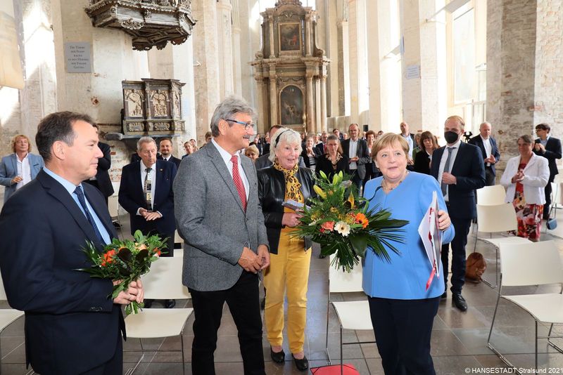 Er galt sowohl dem Organisten Martin Rost, der ein maßgeschneidertes Musikprogramm auf der Königin der Instrumente zum Besten gab, als auch Angela Merkel, deren über 30-jährige Ära als Bundestagsabgeordnete in diesem Jahr endet. Mit dem für sie überraschenden Orgelkonzert, brachte die Hansestadt Stralsund heute (2. September) in der Kulturkirche St. Jakobi ihren Dank für die jahrzehntelange Unterstützung zum Ausdruck. Rund 150 Gäste des gesamten gesellschaftlichen Lebens waren dabei, als Oberbürgermeister Alexander Badrow in seinem Grußwort hervorhob: "Unsere Hansestadt ist Angela Merkel zu großem Dank verpflichtet, sorgte sie doch oft dafür, dass sich das Auge der Weltöffentlichkeit auf Stralsund richtet, allen voran die Präsidenten der USA und Frankreich, die Königlichen Hoheiten von Norwegen sowie Regierungschefs, Botschafter und Astronaut Alexander Gerst. Und die Weltöffentlichkeit bekam eine Stadt zu sehen, die sich seit 1990 derart entwickelt hat, dass wir uns manchmal selbst erstaunt die Augen reiben. Doch es sind nicht nur die Bauten und Bastionen, die Kirchen und Klöster, die Märkte und Museen, die Tore und das Theater, der Hafen und die Häuser der Altstadt, die in neuem Glanz erstrahlen. Es sind auch die Schulen und Straßen, die Spielplätze und Sportanlagen in allen Stadtteilen, die Stralsund zu dem machen, was es heute ist: ein Ort zum Wohlfühlen und Wurzeln schlagen."