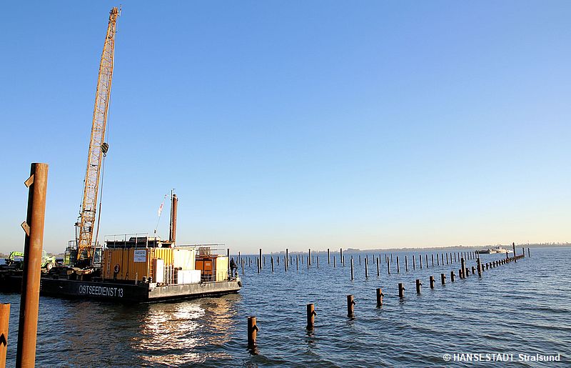 Wer in diesen Tagen von der Hafeninsel kommend am Strelasund entlang schlendert oder die Gegend auf dem Rad erkundet, dem werden drei große Baustellen direkt am und auch im Wasser auffallen.