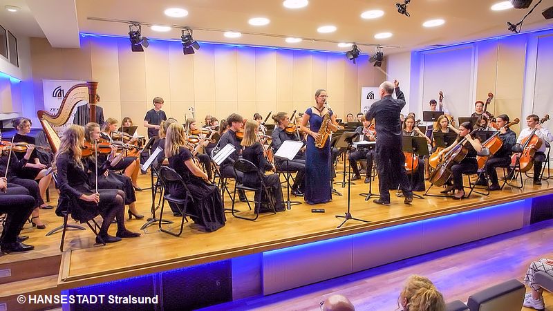 Besonders beeindrucken konnte die junge Saxofon-Solistin Avelina Neye. Die 16-Jährige trat solistisch im dreisätzigen Triptychon für Alt-Saxofon und Orchester des sowjetischen Komponisten Grigory M. Kalinkovich auf und konnte durch eine virtuose und souveräne Spielfreude begeistern. Avelina wird an der Kreismusikschule Wolgast-Anklam und in der YARO Rostock gefördert.