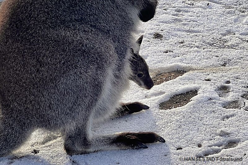Da sie aus Südaustralien kommen, sind sie an niedrige Temperaturen gewöhnt und haben daher mit unseren Wintertemperaturen keine Probleme. Wie in ihrer australischen Heimat leben sie auch im Zoo Stralsund mit Emus zusammen. Die Zoobesucher können die Tiere aus nächster Nähe in einer begehbaren Anlage beobachten. Mit etwas Glück kann dann beobachtet werden, wenn das Jungtier mit seinen großen Augen aus dem Beutel der Mutter heraus die Welt erkundet.