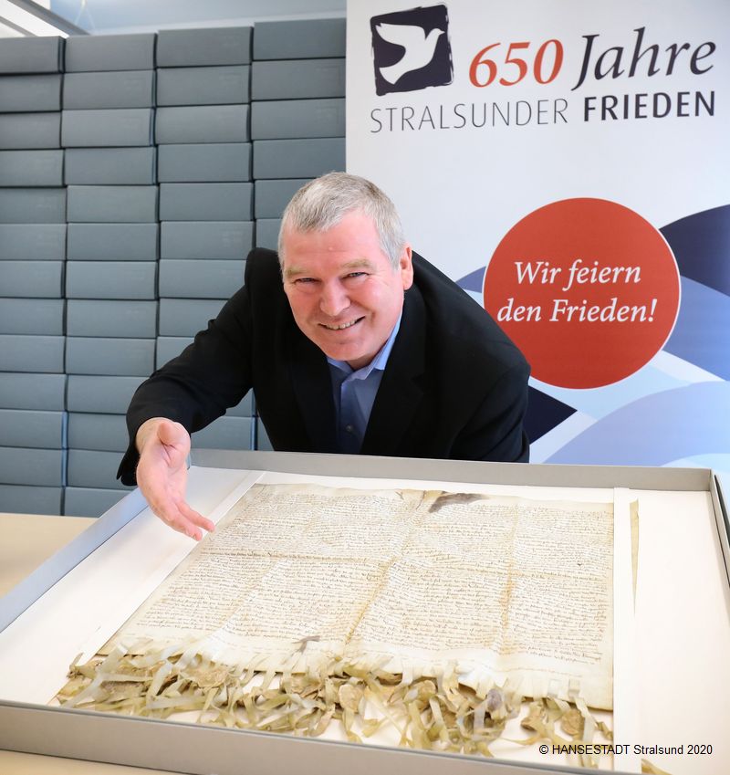 Für Stralsunds Oberbürgermeister Dr. Alexander Badrow ist das ein Tag der Freude: "Seit 2002 sind Stralsund und Wismar Weltkulturerbe, jetzt gehört unser 'Stralsunder Frieden von 1370' zum Weltdokumentenerbe. Die heutige Entscheidung der UNESCO ist eine weitere große internationale Auszeichnung für unsere Hansestadt. Neben der mittelalterlichen Stadtstruktur, den großartigen Bauwerken der Backsteingotik spiegeln auch die im Stadtarchiv bewahrten Dokumente Stralsunds reiche Hansegeschichte. Zusammen mit den Dokumenten aus den Partnerarchiven dokumentieren und beschreiben unsere Stralsunder Friedensurkunden das historische Phänomen Hanse und verankern den einzigartigen Städtebund auf diese Weise im Gedächtnis der Menschheit weltweit. Ich danke der Hansestadt Lübeck für die Koordinierung der Antragstellung und freue mich auf die internationale Zusammenarbeit mit unseren Partnern ganz im Sinne der Hanse."