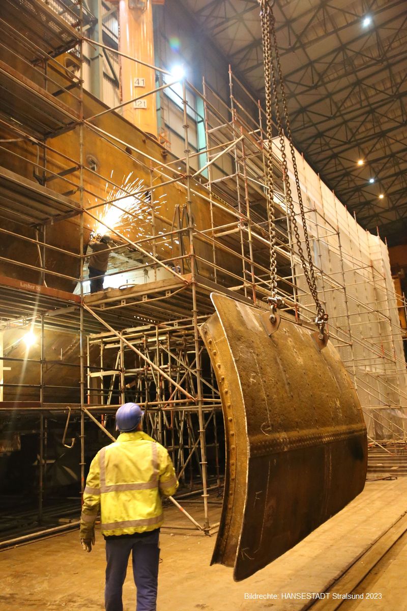 Der 1. Dezember 2023 ist ein Meilenstein bei der Sanierung der "Gorch Fock 1". Mit diesem Tag sind 70 m² Außenhaut getauscht, und ein großes Segment wurde eingesetzt. Das musste auf Höhe Maschinenraum herausgeschnitten werden, um große Motoren aus dem Schiffsinneren nach draußen befördern zu können.