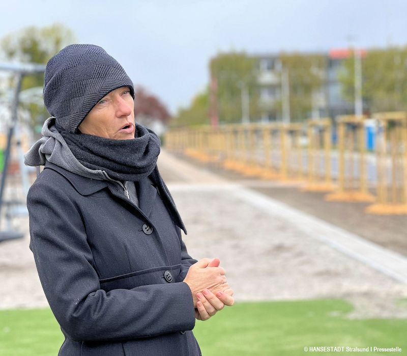 Nach dem Abriss der aus den 1950er Jahren stammenden Häuser bietet sich nun eine große Fläche mit Wegen, Straßen und einer Baumallee mit 75 Hainbuchen. Unter der Regie der Stralsunder Stadterneuerungsgesellschaft SES entstand hier eine völlig neue multifunktionale Anlage für die Stralsunderinnen und Stralsunder, insbesondere die zukünftigen Anwohner. Denn: links und rechts der Anlage sollen Häuser gebaut werden, die Ausschreibung dafür läuft gerade. Und wenn alles klappt, soll im Juni Baustart sein.