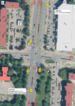 Damit Fußgänger gefahrlos den Heinrich-Heine-Ring überqueren können, sind die Fahrspuren dann auf dem Heinrich-Heine-Ring auf je eine Richtung reduziert.