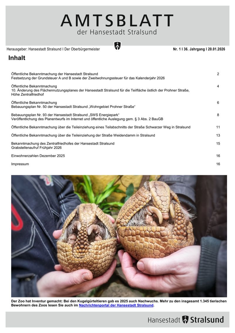 Die Hebesätze für die Grundsteuer A und B in der Hansestadt Stralsund werden mit dem ersten Amtsblatt des Jahres 2026 bekanntgemacht, ebenso die Höhe der Zweitwohnungssteuer für das Kalenderjahr 2026