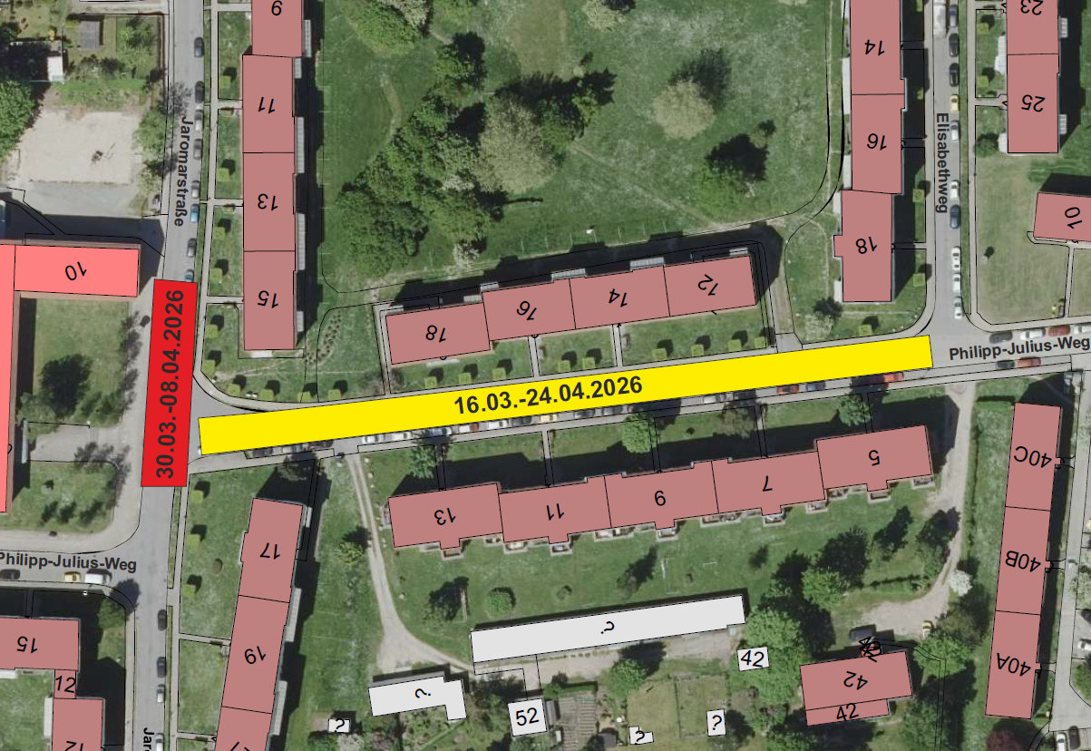 Im Zeitraum vom 30. März bis zum 8. April ist zudem zusätzlich eine Sperrung der Jaromarstraße im Bereich der Einmündung Philipp-Julius-Weg notwendig.